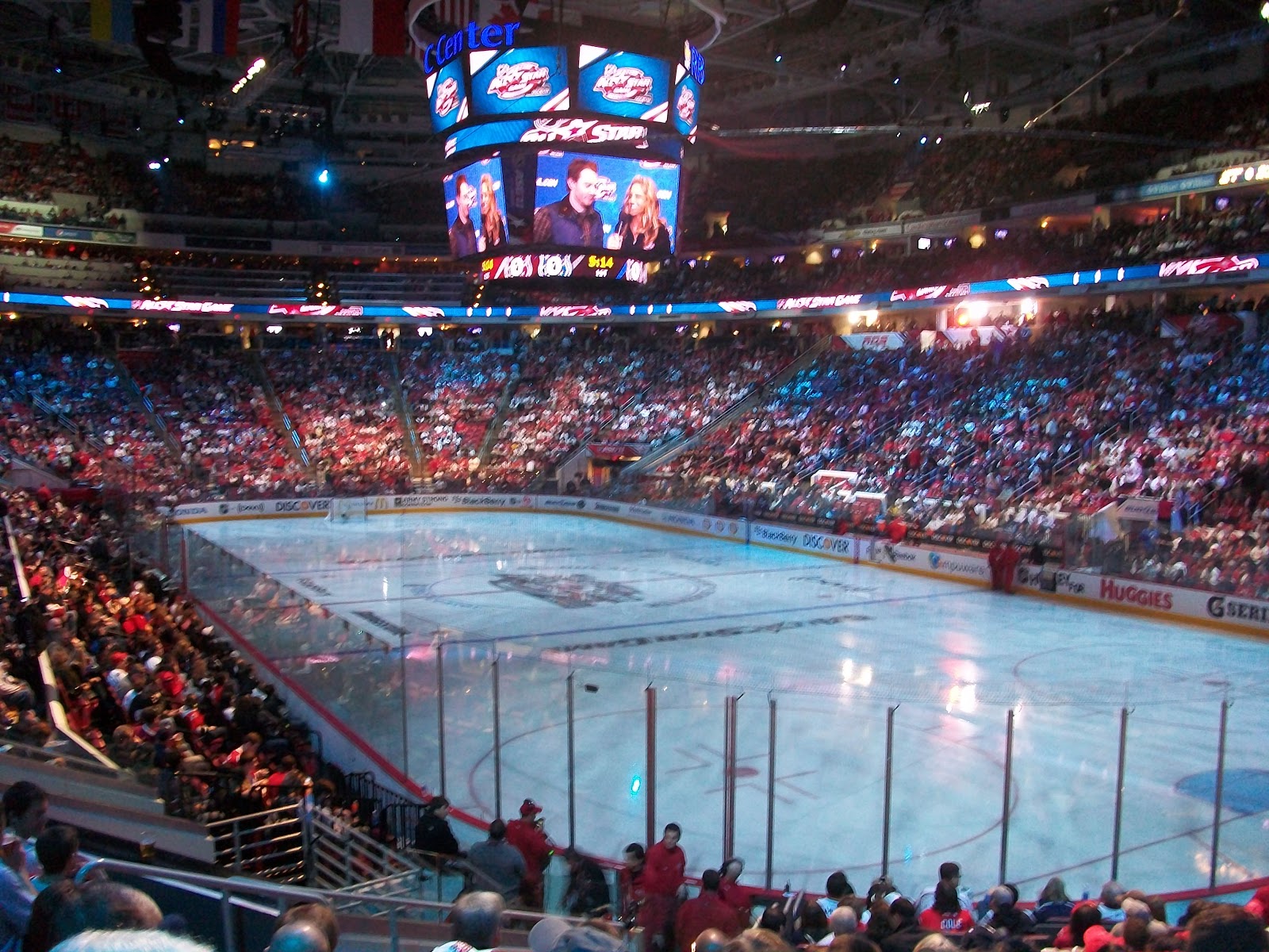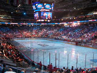 Our seats were great! They were lower level, kind of cornered, but you could see every minute of the action. The festivities started off with a bang (and a surprise). A group of kids skated onto the ice and did a narration piece set like they were going to start a pickup game. There were a couple team captians who were picking the players by choosing hockey sticks at random. One by one, they picked; but then when one kid picked up a hockey stick and a man said "Hey, that's my stick." It was Rod Brind'Amour, former Hurricanes captain. Then the other kid picked up a stick and the same thing happened. This time, it was Ron Francis, former Canes player and now assistant coach. That was an amazing!